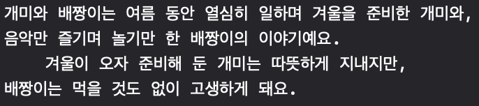 "겨울이 오자 준비해 둔 개미는 따뜻하게 지내지만,"이라는 문장이기준 들여 쓰기보다 추가로 더 들여 쓰기 되었다면, 실제 출력에서도 해당 줄은 그만큼 더 들여 쓰기 되어 나타납니다.