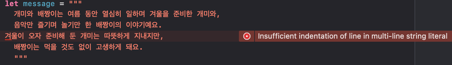 출력 결과 Swift에서 세 개의 큰따옴표(""")를 사용하여 여러 줄의 문자열을 정의할 때, 문자열의 들여 쓰기는