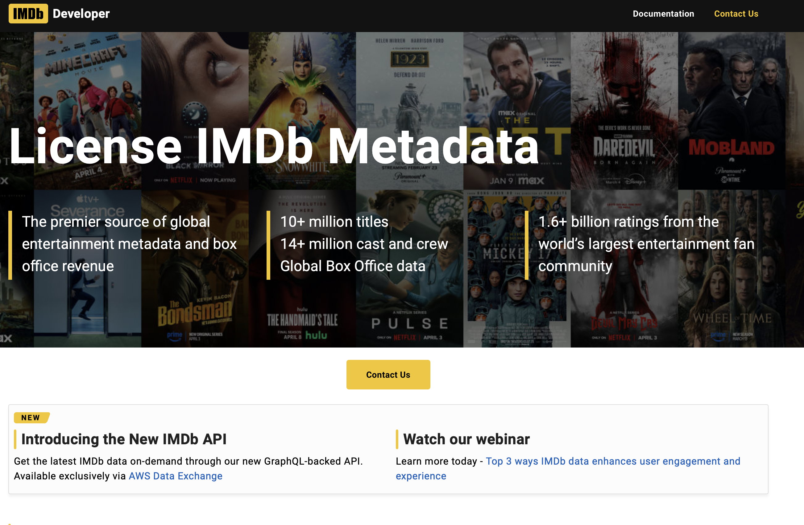 License IMDb metadata from over 10 million movies, TV series, and Video Game titles including 14 million cast and crew, 1.6 billion star ratings, and global box office grosses from Box Office Mojo. All IMDb data products are updated daily and easily access