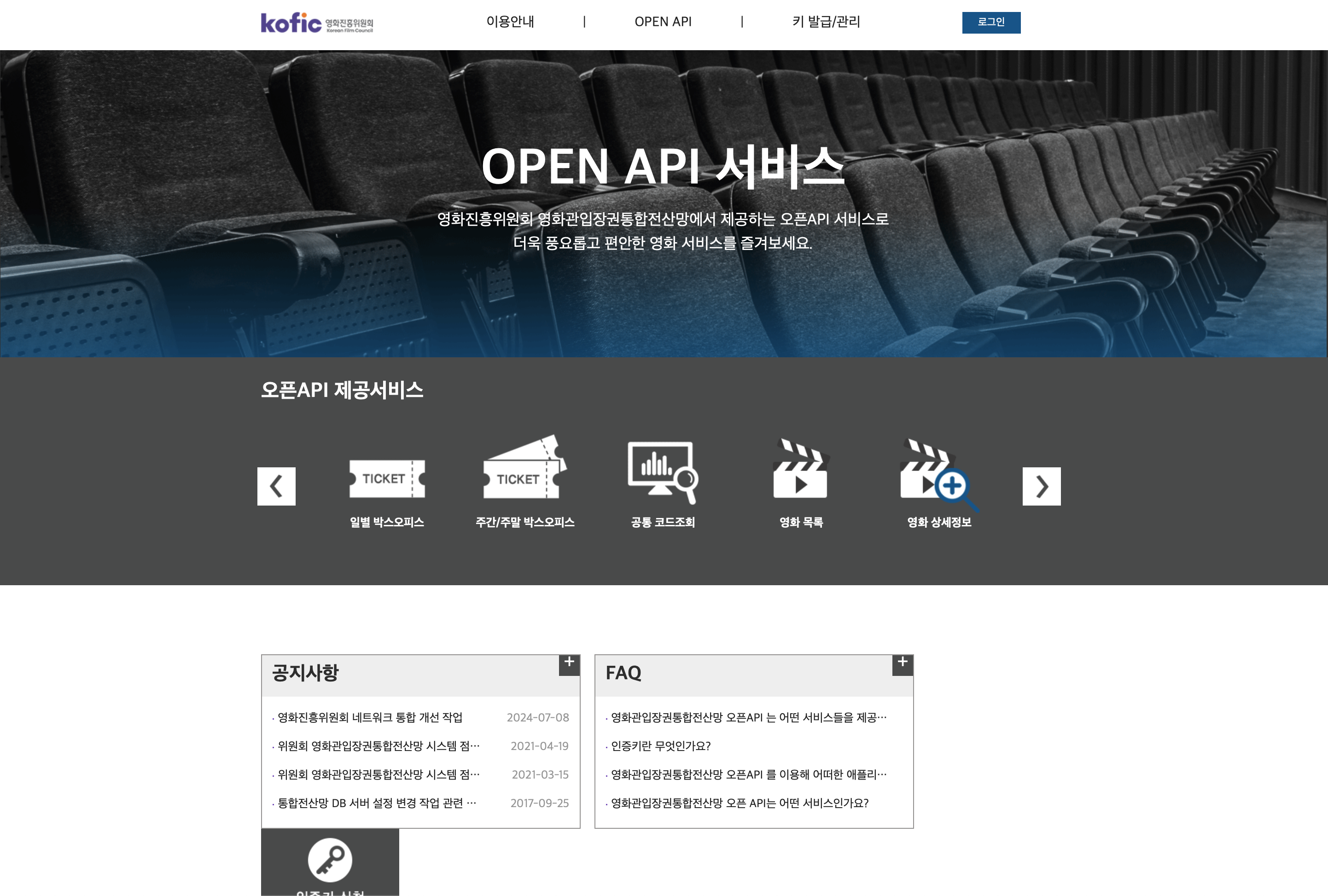 OPEN API 서비스 영화진흥위원회 영화관입장권통합전산망에서 제공하는 오픈API 서비스로 더욱 풍요롭고 편안한 영화 서비스를 즐겨보세요.