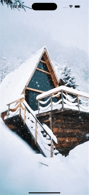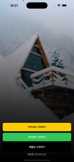 import AVKit import SwiftUI struct VideoBackgroundView<Content: View>: View { private let loopingPlayer = LoopingPlayer(videoName: "winter") let content: () -> Content init(@ViewBuilder content: @escaping () -> Content) { self.content = content } var body: some View { GeometryReader { proxy in // 1) VideoPlayer를 전체 화면에 깔기 VideoPlayer(player: loopingPlayer.player) .aspectRatio(contentMode: .fill) ✅ .frame(width: proxy.size.width, height: proxy.size.height) .allowsHitTesting(false) ✅ .onAppear { loopingPlayer.player.play() } // 2) 앞쪽에 올 UI content() .padding() } .ignoresSafeArea() } }import AVKit import SwiftUI struct ContentView: View { var body: some View { VideoBackgroundView { // TODO: 로그인 UI 배치하기 } } }VideoPlayer에 위에서 생성한 플레이어를 전달하여 뷰가 나타날 때 재생하도록 지정해줍니다.