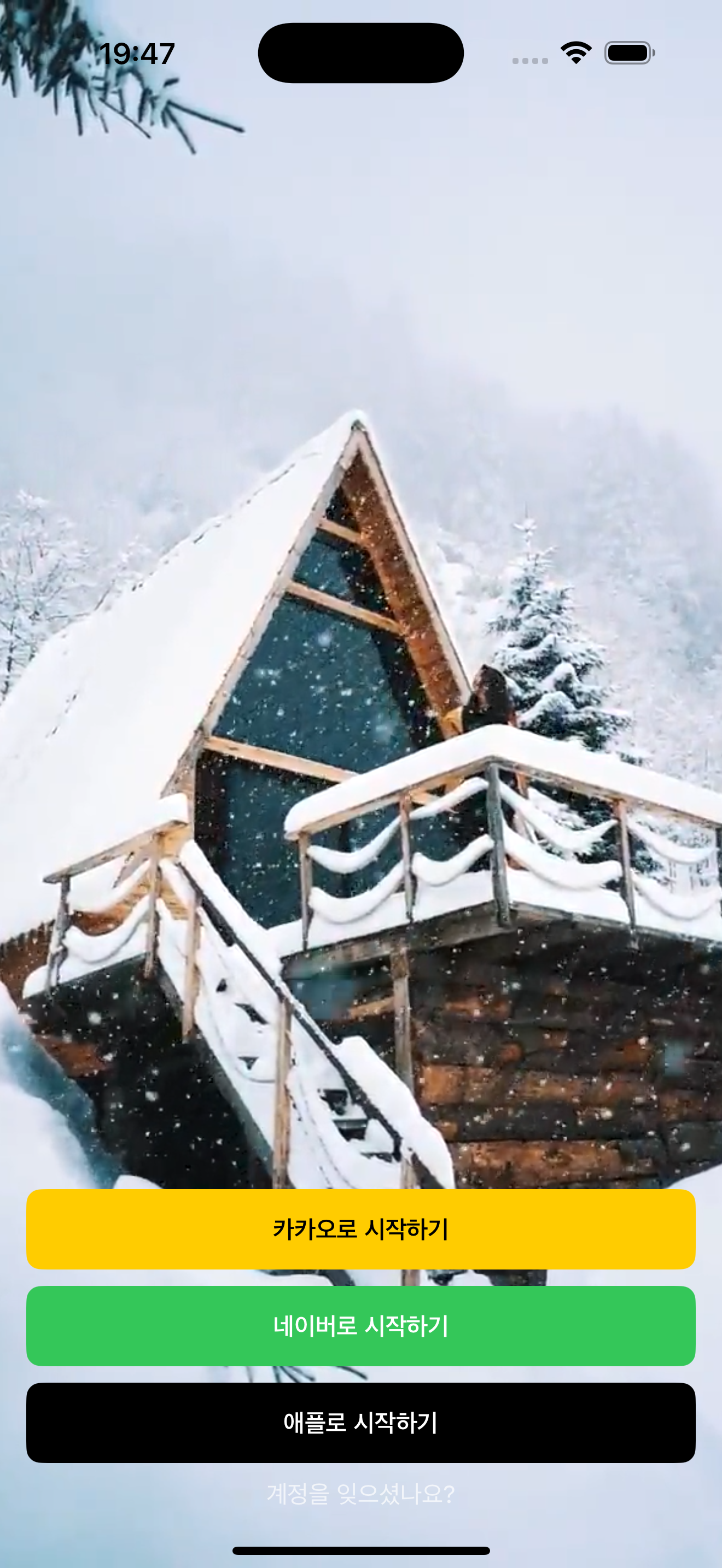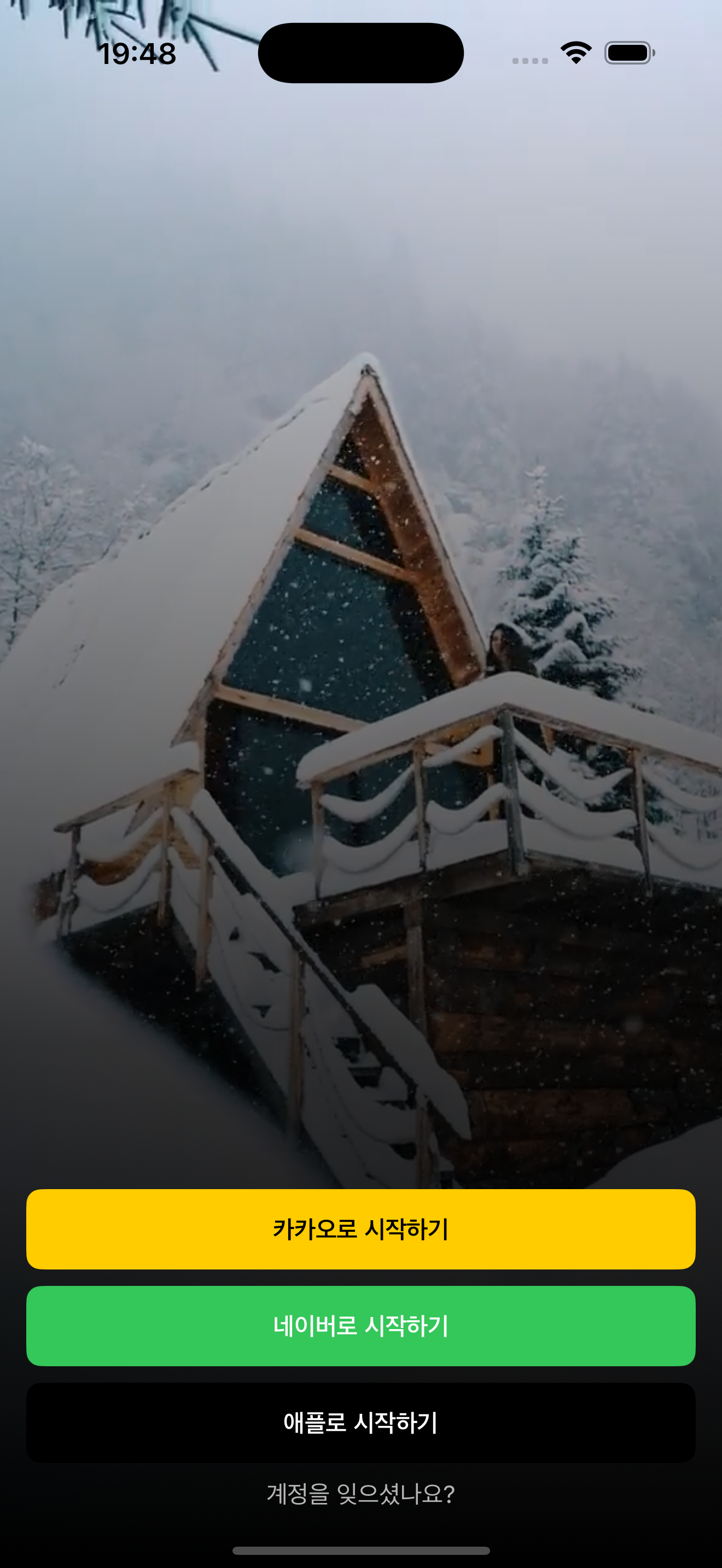 import AVKit import SwiftUI struct ContentView: View { let buttons: [(title: String, tint: Color, text: Color)] = [ ("카카오로 시작하기", .yellow, .black), ("네이버로 시작하기", .green, .white), ("애플로 시작하기", .black, .white) ] var body: some View { VideoBackgroundView { VStack(spacing: 10) { Spacer() ForEach(buttons, id: \.title) { button in SocialLoginButton( title: button.title, tintColor: button.tint, textColor: button.text ) { print("\(button.title) tapped") } } Text("계정을 잊으셨나요?") .font(.system(size: 15)) .foregroundColor(.white.opacity(0.7)) } .padding(.bottom, 20) } }실행해 보니 버튼과 텍스트는 의도대로 배치됐지만, 동영상 배경 때문에 가독성과 가시성이 떨어져