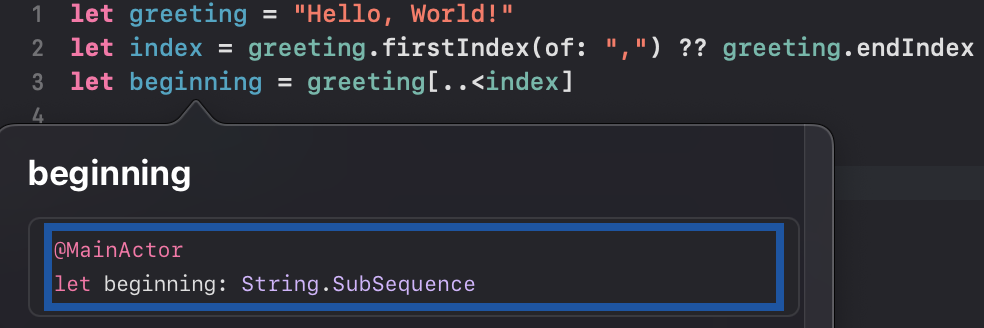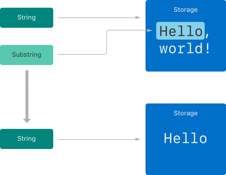 let greeting = "Hello, World!" let index = greeting.firstIndex(of: ",") ?? greeting.endIndex let beginning = greeting[..<index] print(beginning) // Hello // beginning의 타입은 Substring // String처럼 다루기위해 장기 보관하기 위해서는 아래처럼 변환해야 함 let newString = String(beginning)