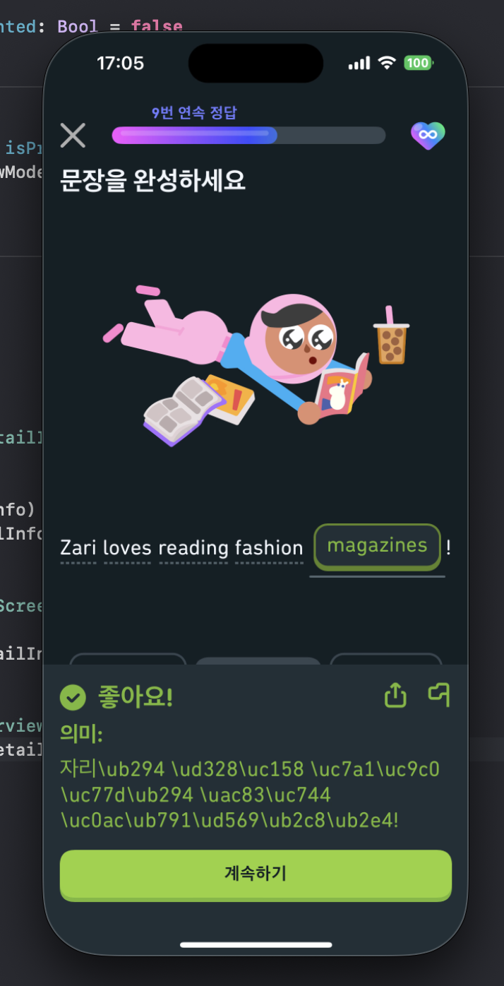 import Foundation let text = "a🐥♥" for character in text { print("Character: \(character)") for scalar in character.unicodeScalars { print(" Scalar: \(scalar) → U+\(String(format: "%04X", scalar.value))") } } /* Character: a Scalar: a → U+0061 Character: 🐥 Scalar: 🐥 → U+1F425 Character: ♥ Scalar: ♥ → U+2665 */+ 갑자기 보다가 생각난 내용인데, 가끔씩 듀오링고를 하다 보면 아래와 같은 버그를 볼 수 있는데,