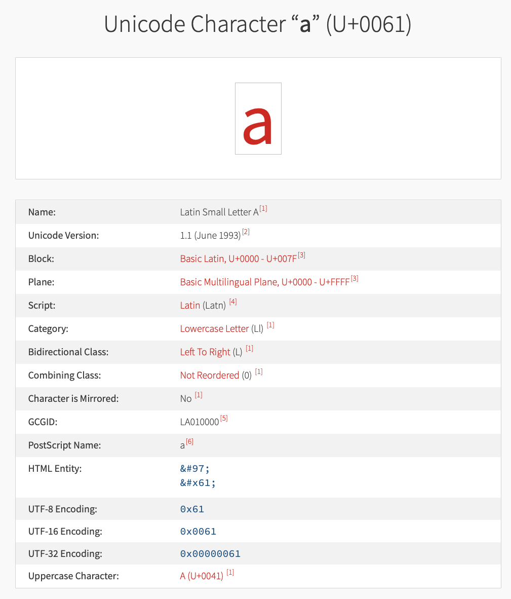 - “a”는 U+0061 (LATIN SMALL LETTER A)